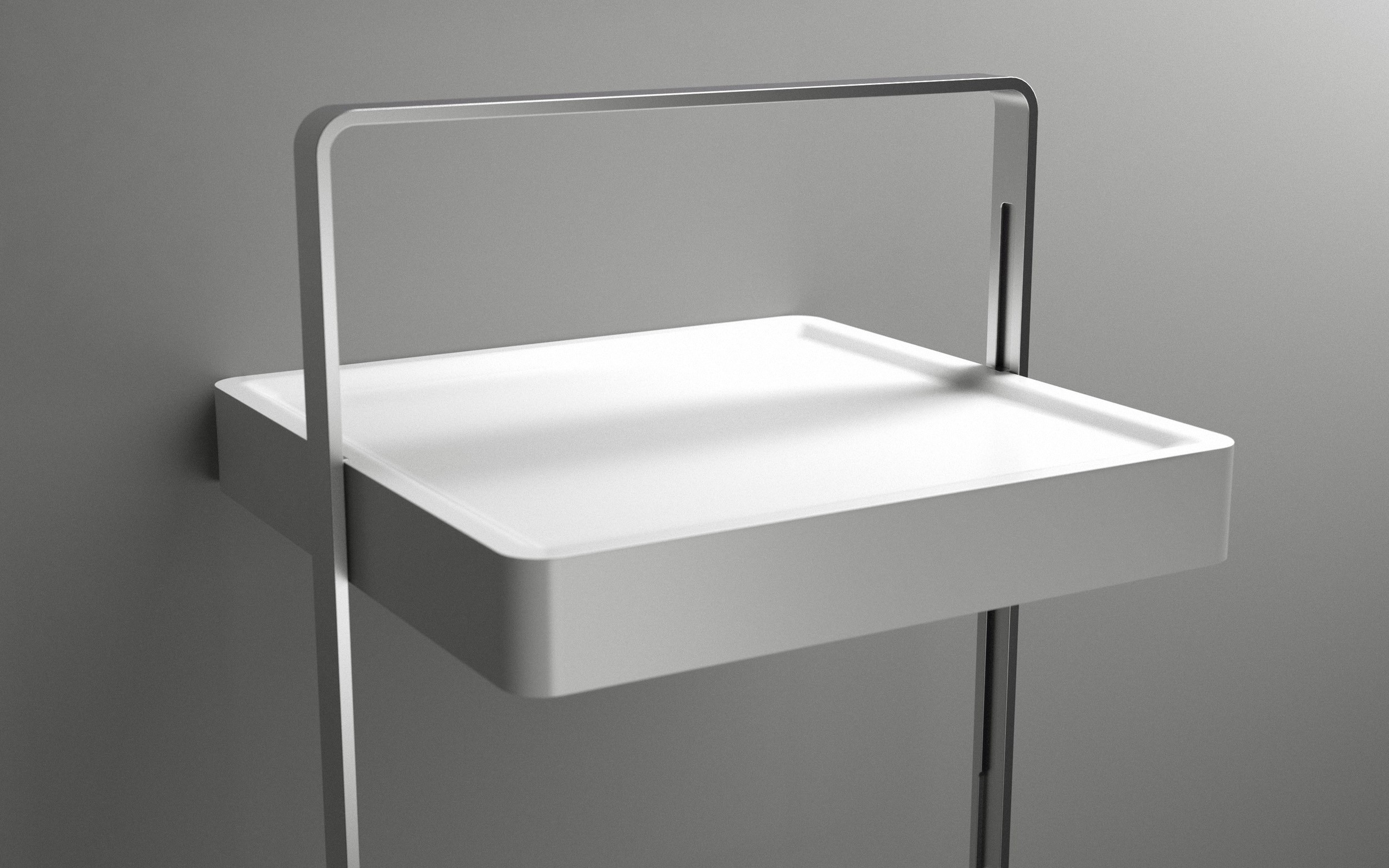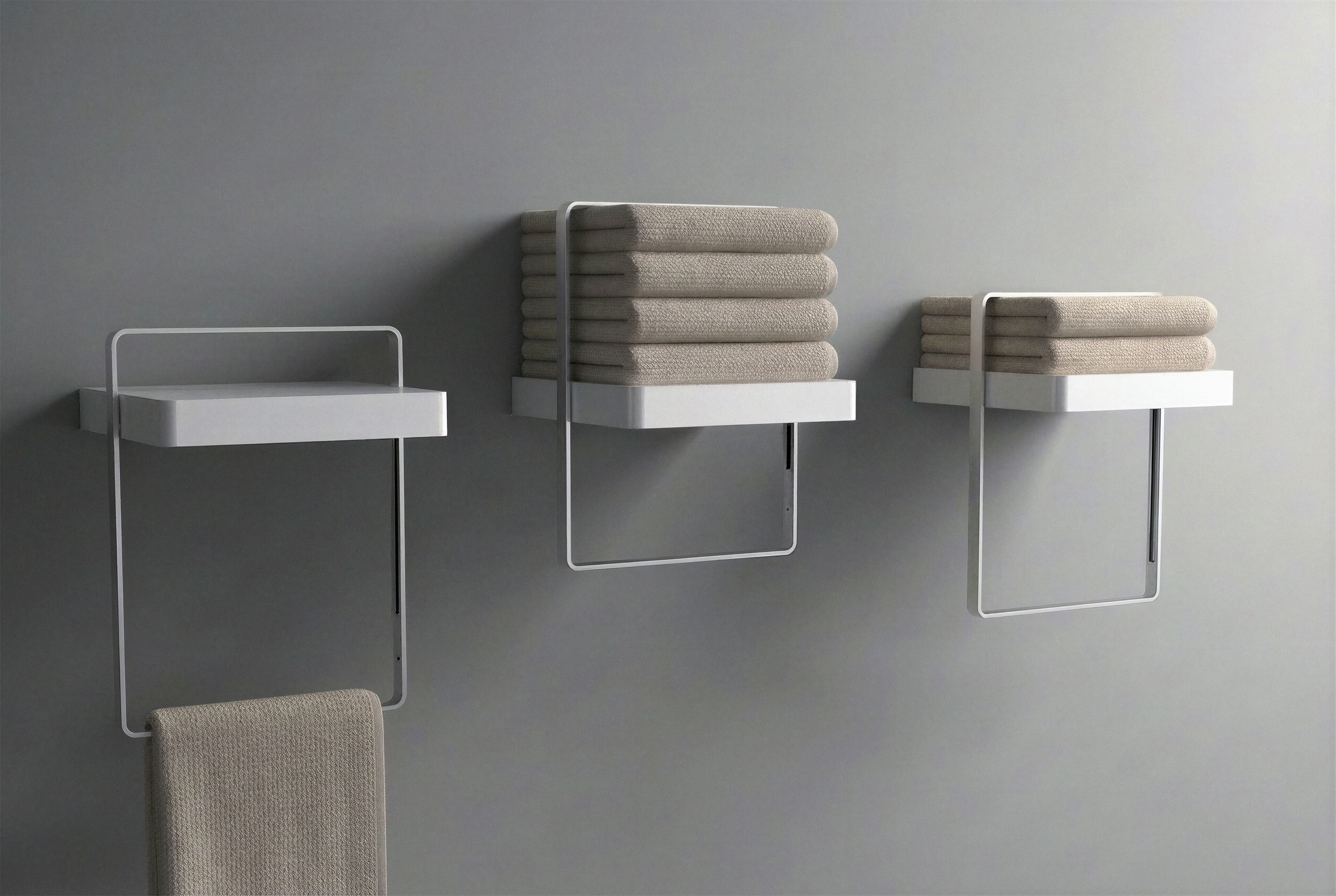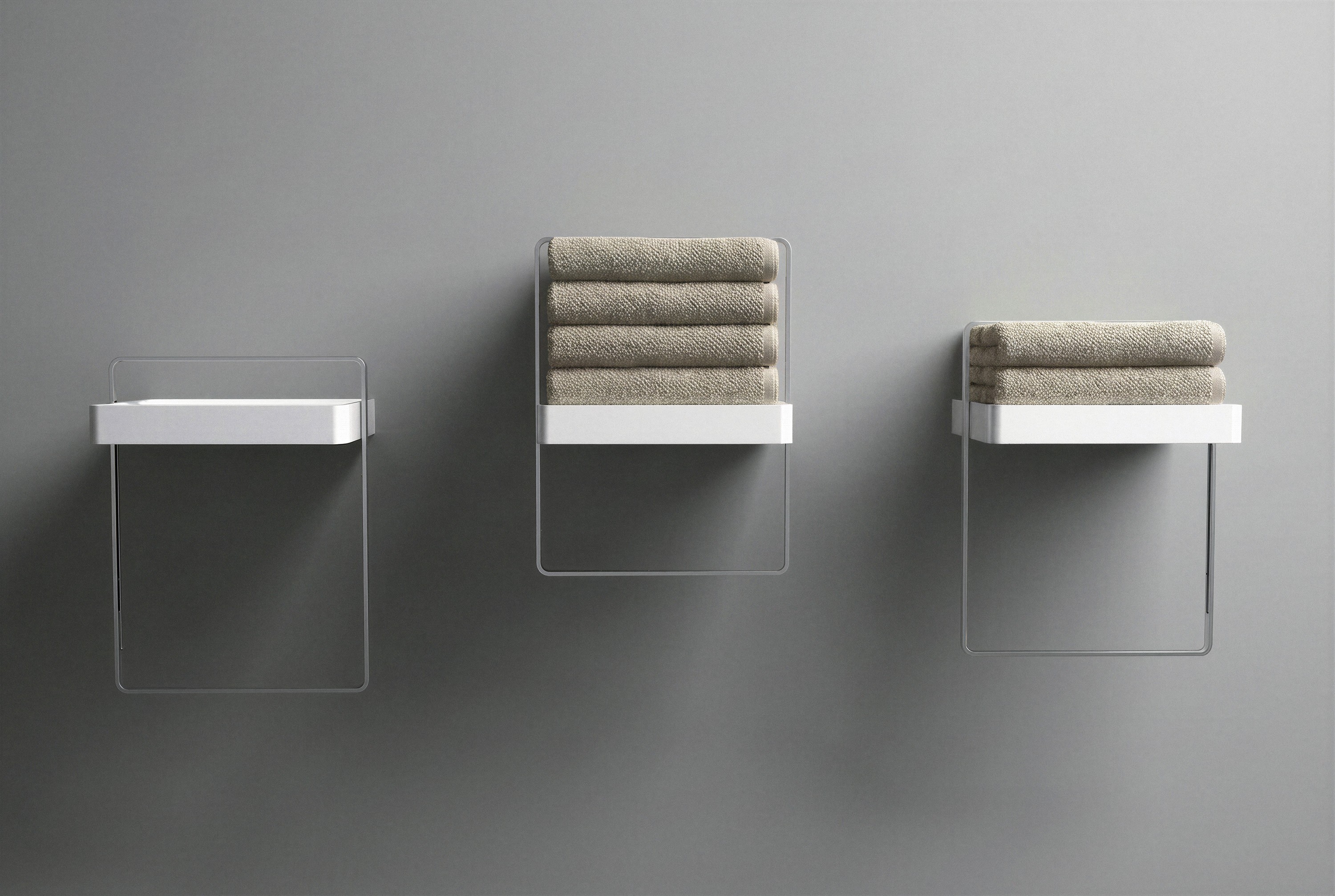 Slide is a wall-mounted system that combines storage and use within a single form. A minimal frame supports a tray while also functioning as a towel holder, allowing textiles to be stored, displayed, and dried in place. The result is a compact element that reduces visual and functional complexity.