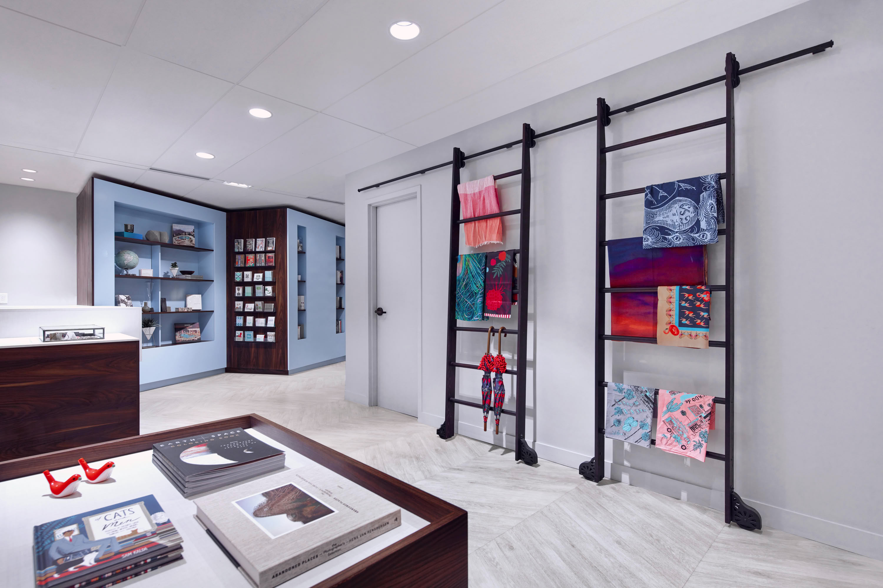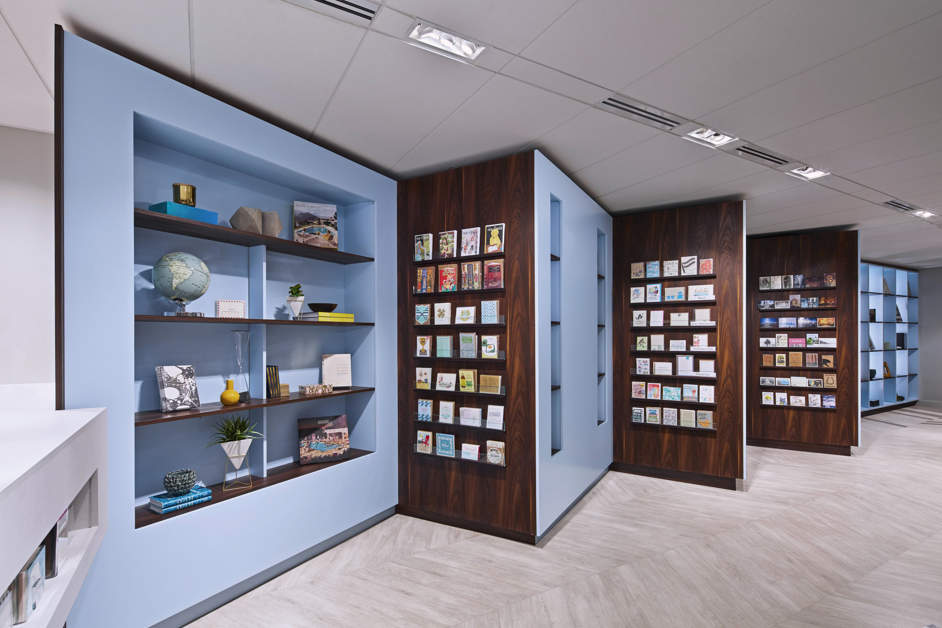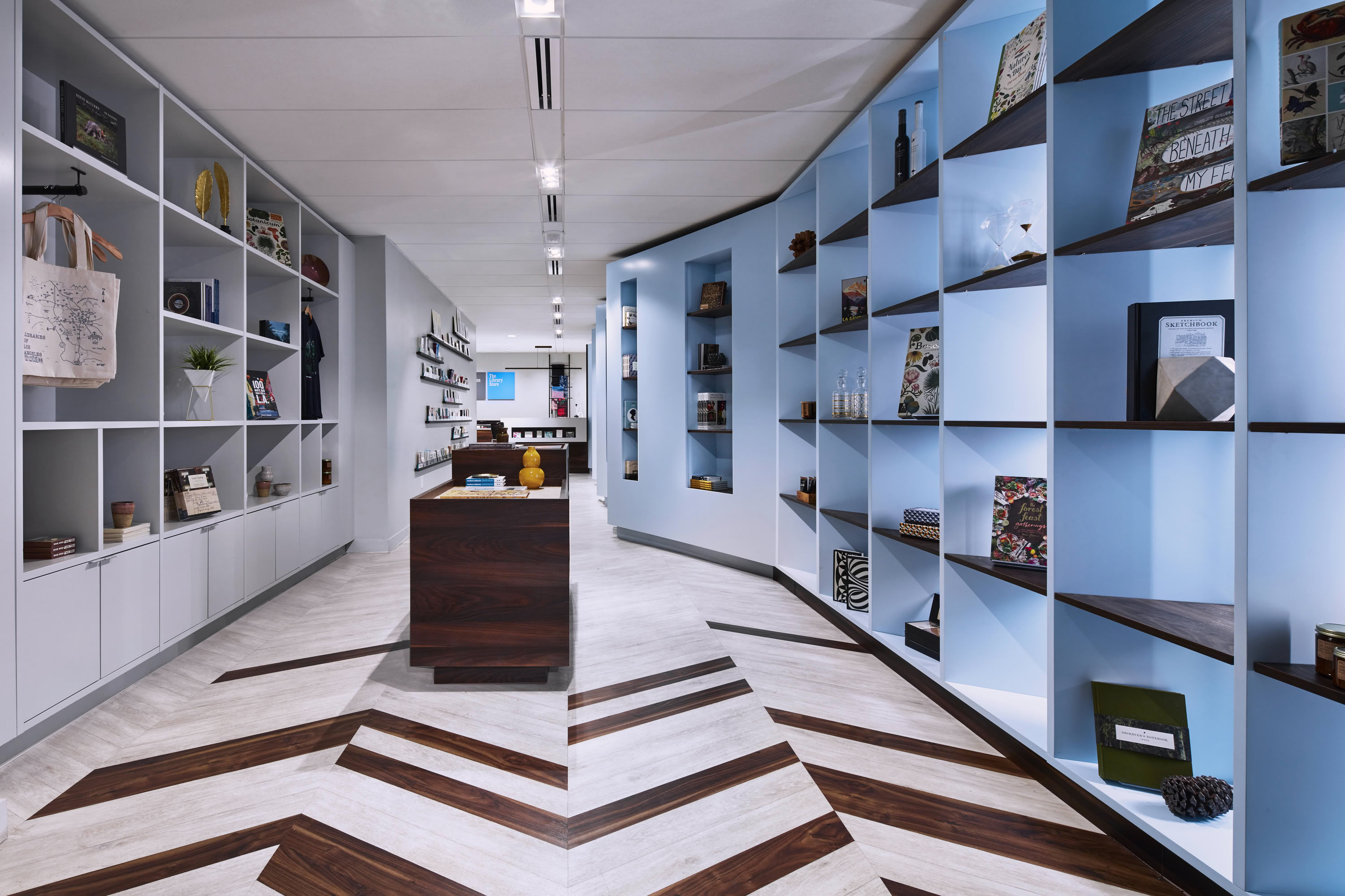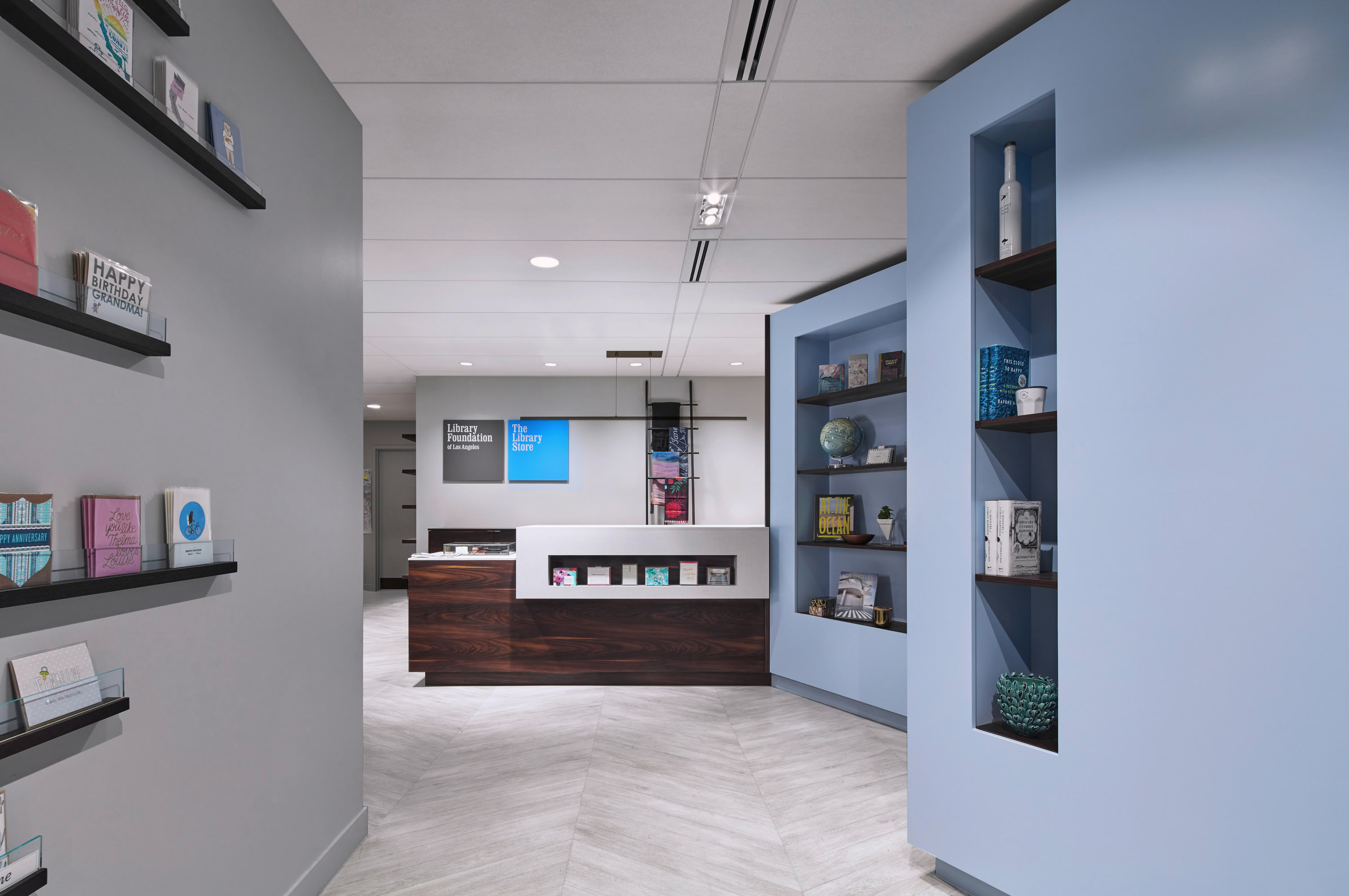 Located within the historic Los Angeles Central Library, The Library Store introduces a contemporary retail space into a landmark setting. A lenticular strategy uses angled walls and display structures to create two distinct spatial readings within a single space. From one direction, vibrant blue surfaces define the store; from the other, they recede to reveal warm, wood-toned shelving aligned with the historic interior.