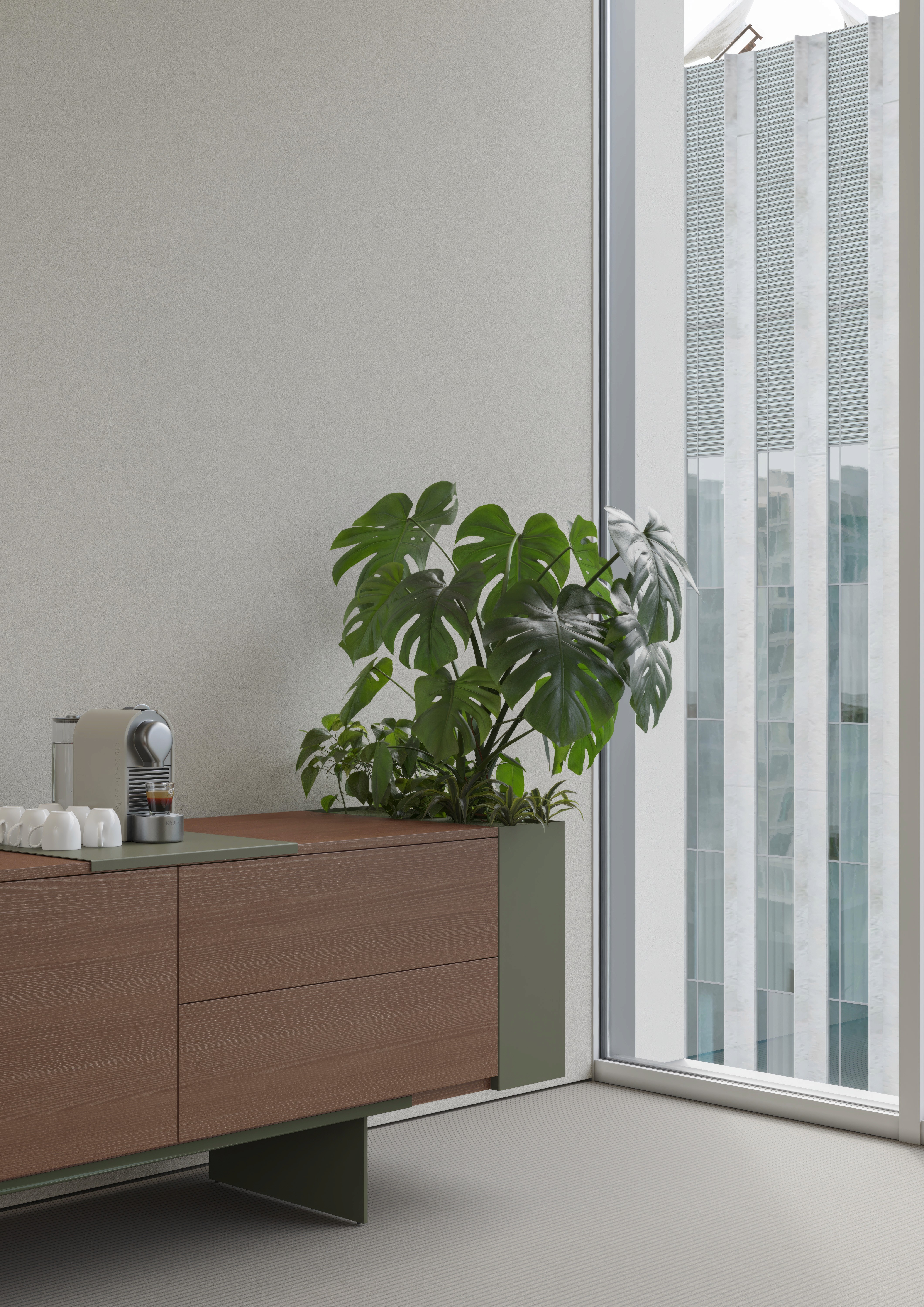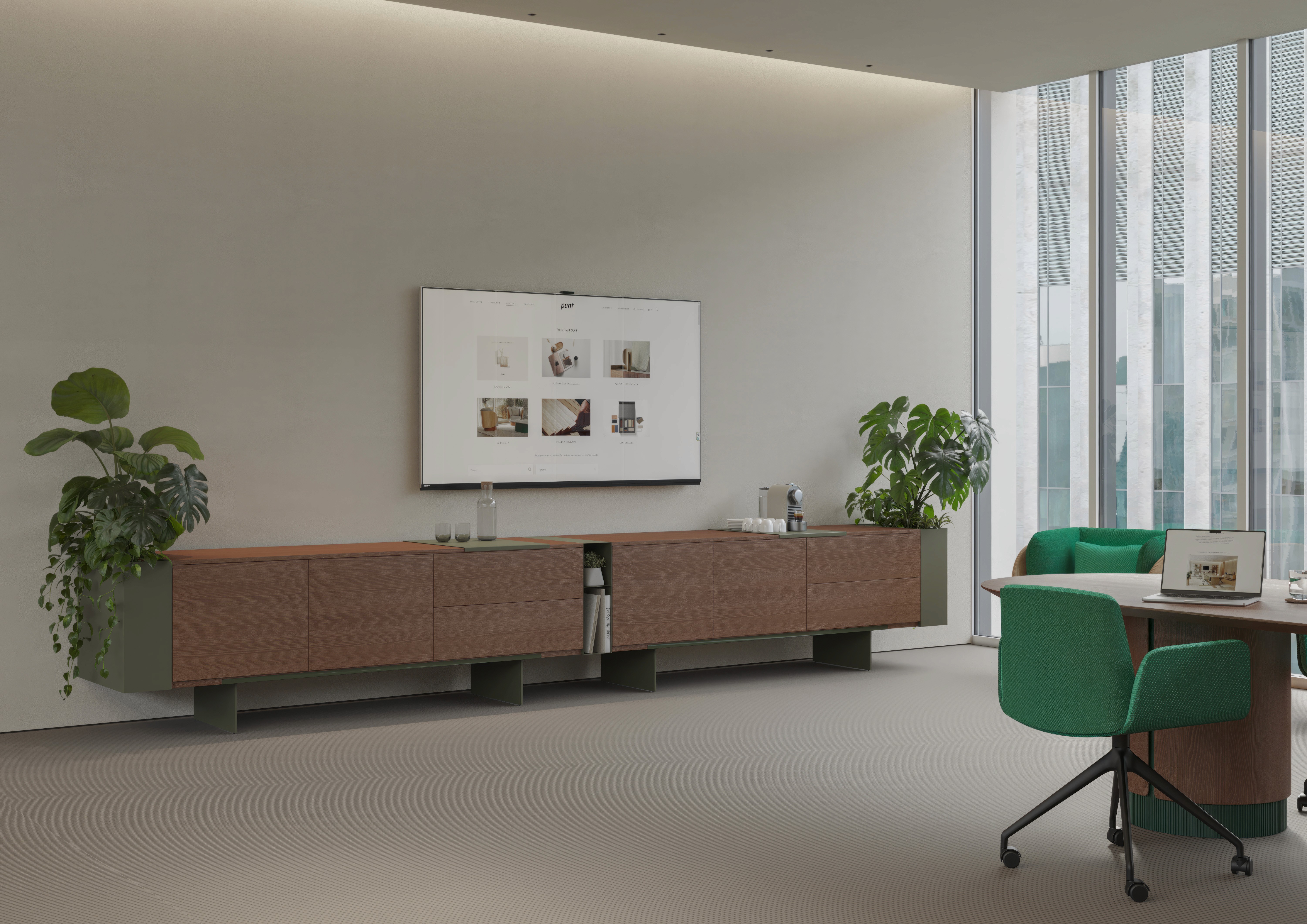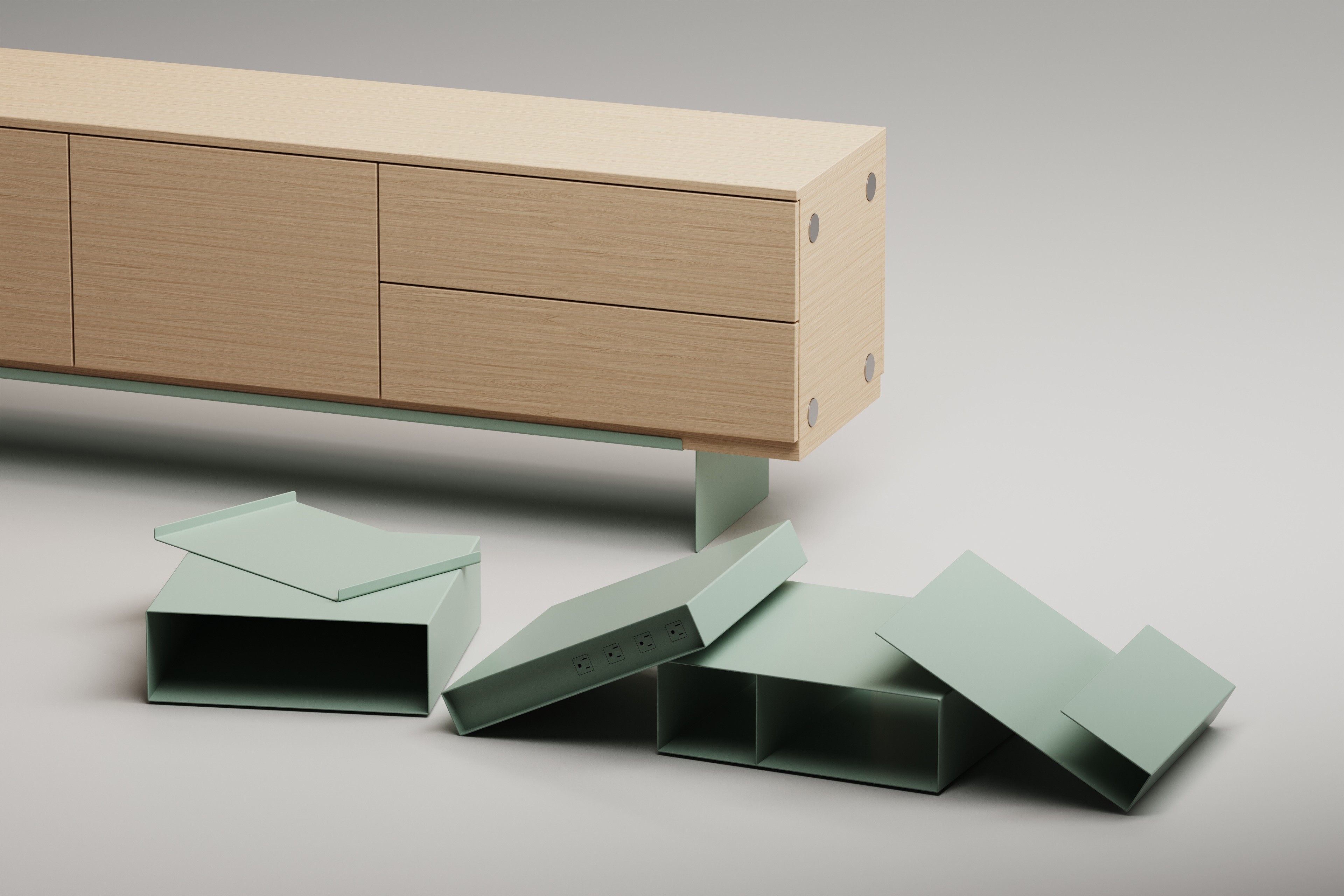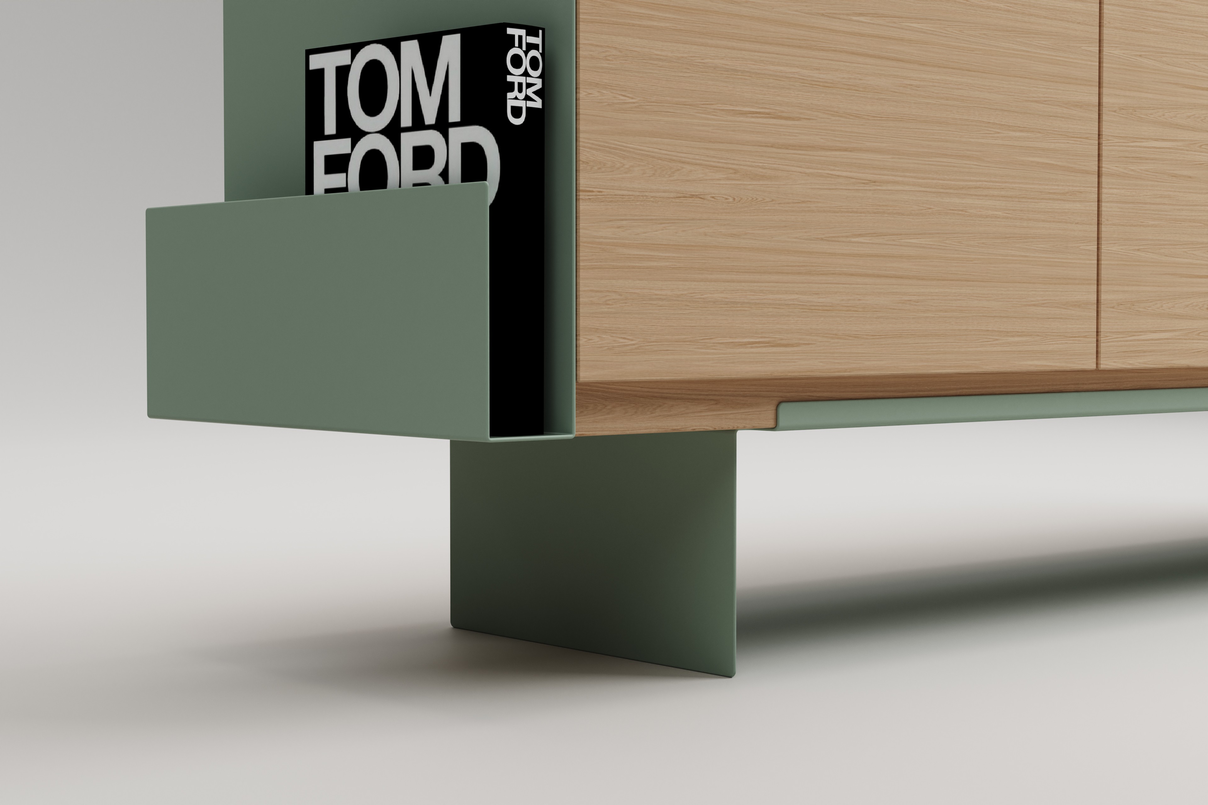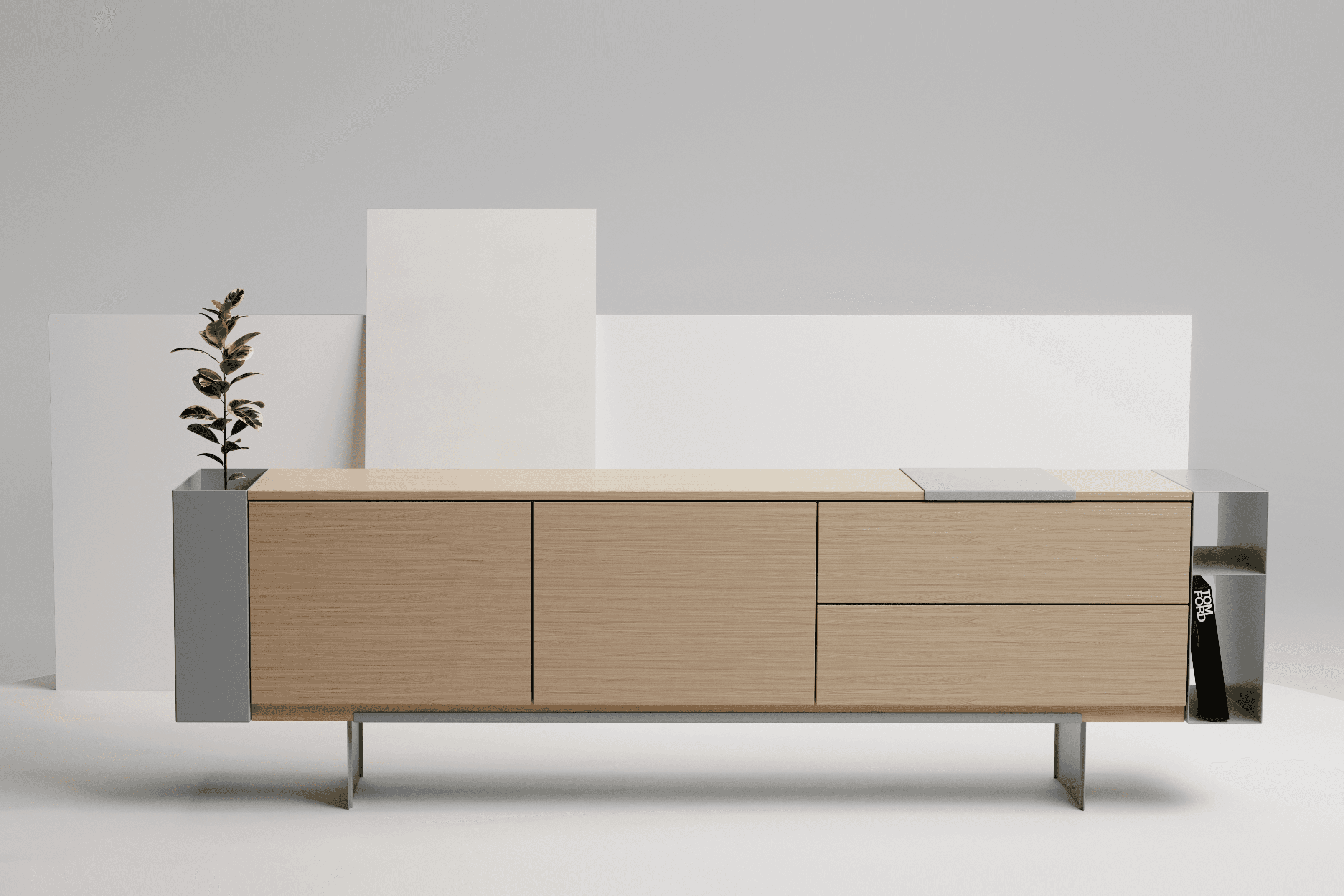 Magneto is a modular sideboard system defined by a concealed magnetic logic. Metal accessories attach seamlessly to the case, allowing shelving, planters, and trays to be arranged and reconfigured as needed. Minimal and graphic in expression, the system supports variation in function, color, and material while maintaining a clear, resolved composition. Finished on all sides, it can also operate as a freestanding element or space divider.