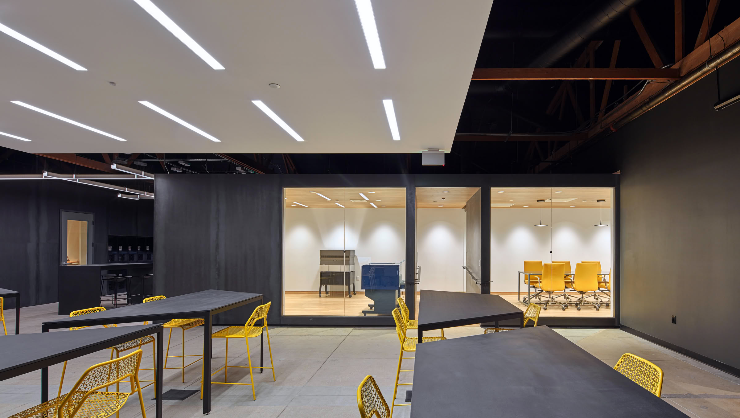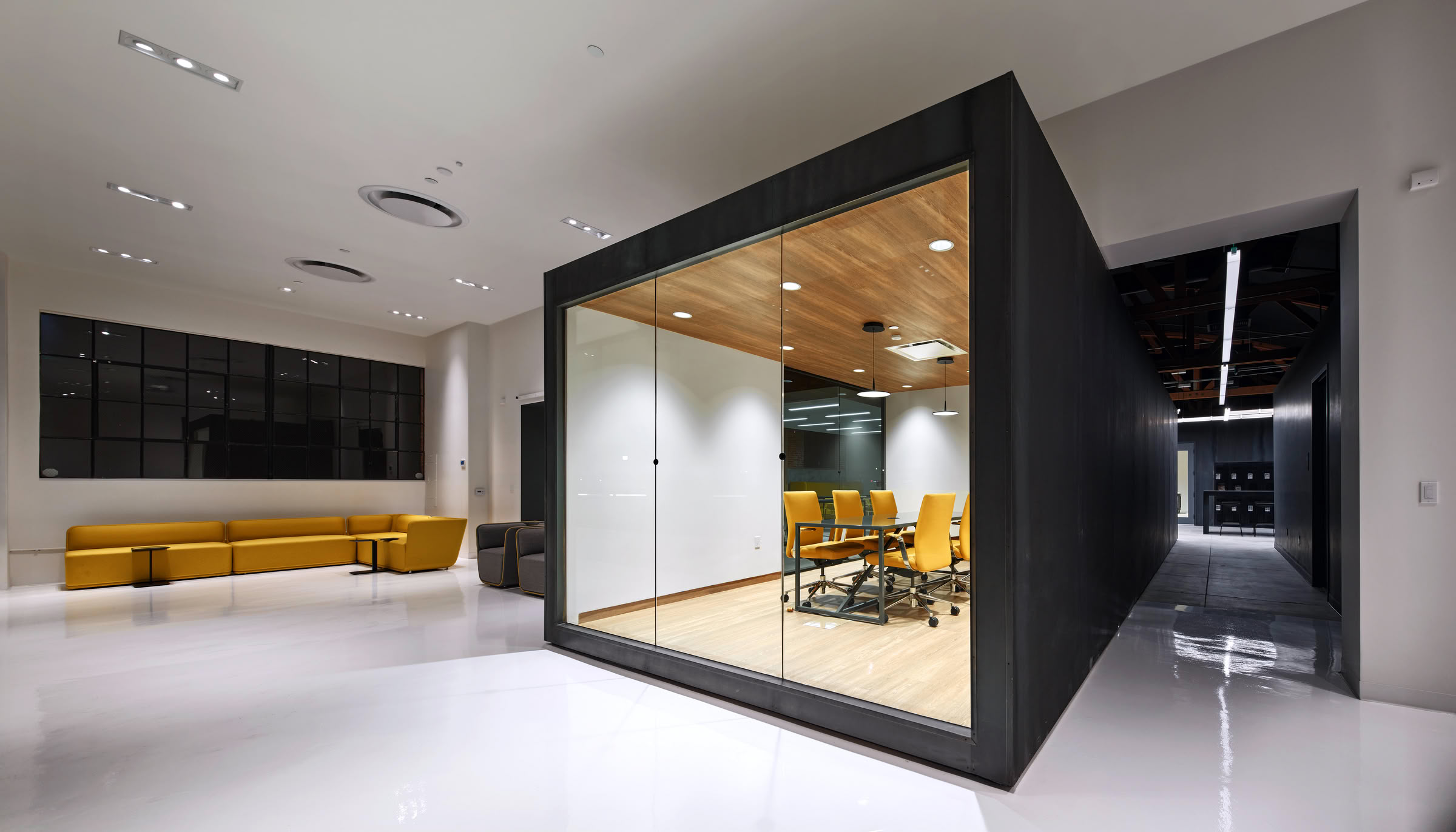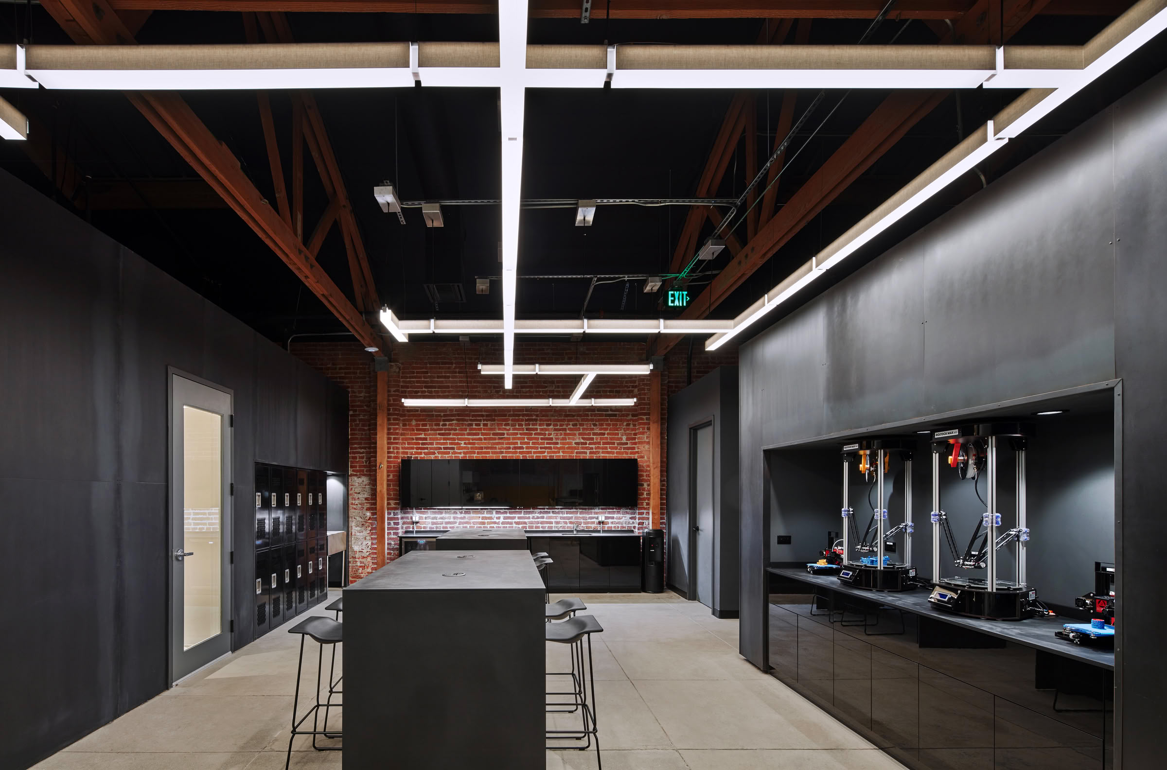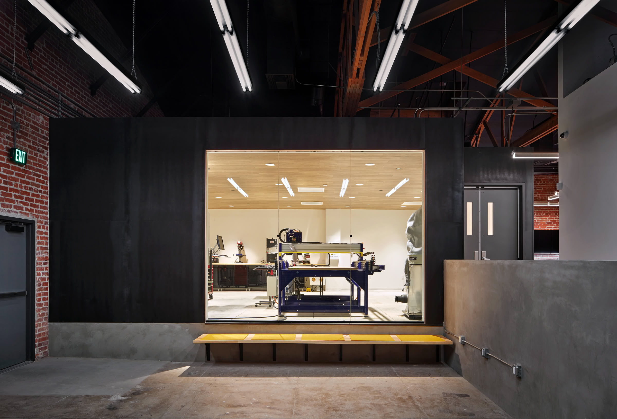 A single 4,900-square-foot floor was designed to operate as gallery, fabrication lab, residency, and brand activation space. The tension is resolved through deliberate contrast: blackened steel, raw concrete, and rough-sawn timber set against precise white surfaces and refined furnishings. The result functions as factory, gallery, and stage within a single continuous environment.