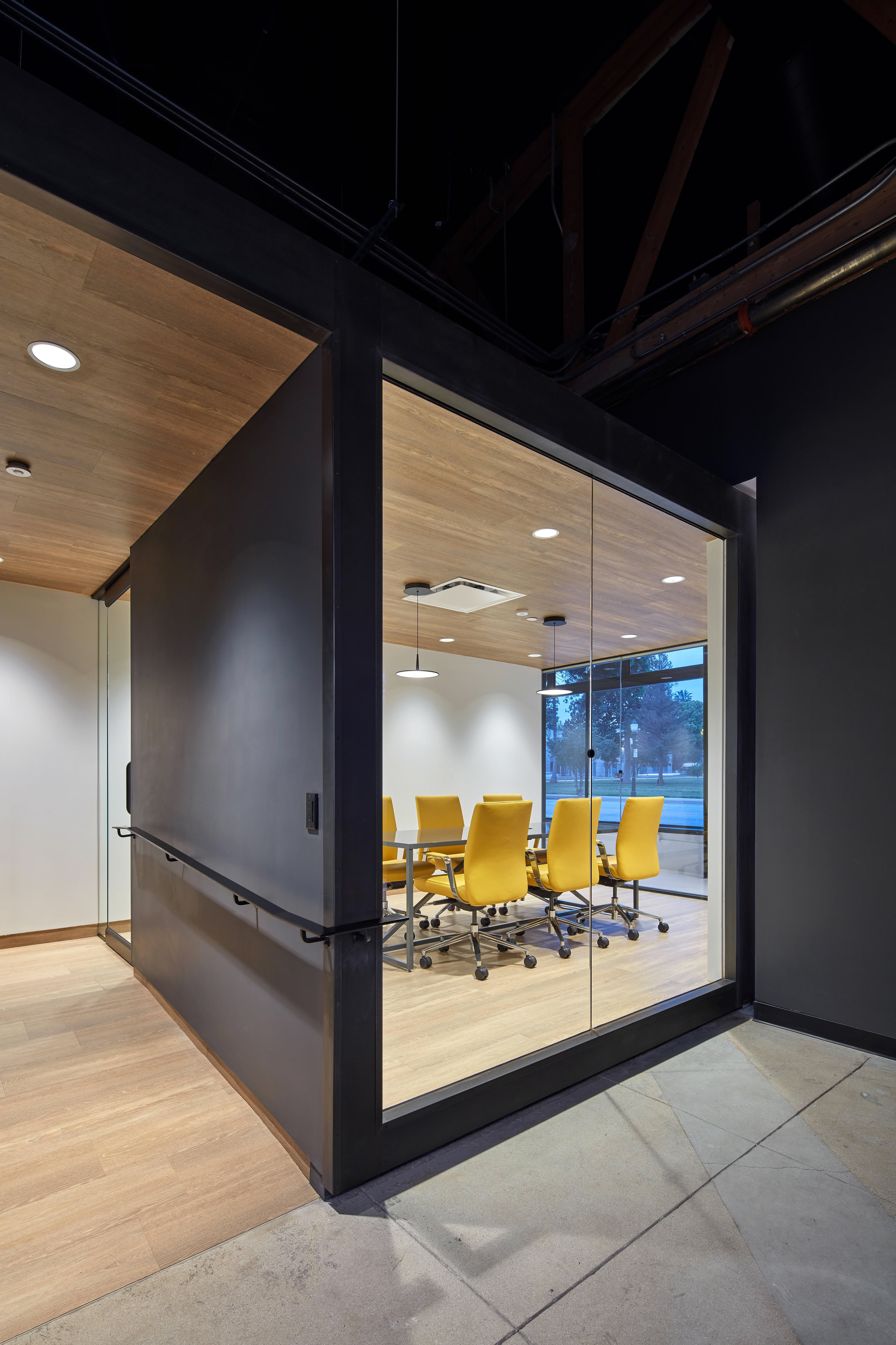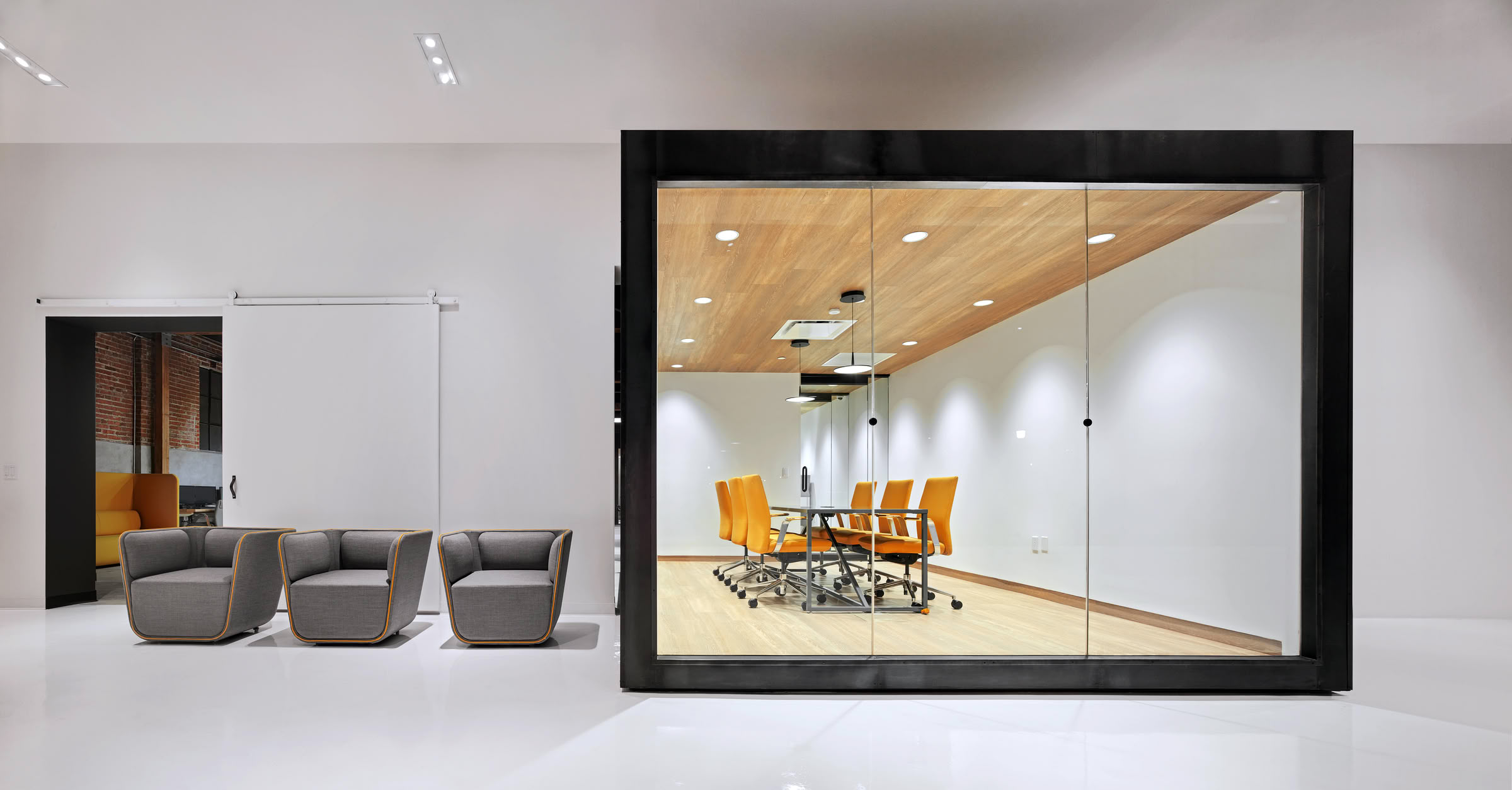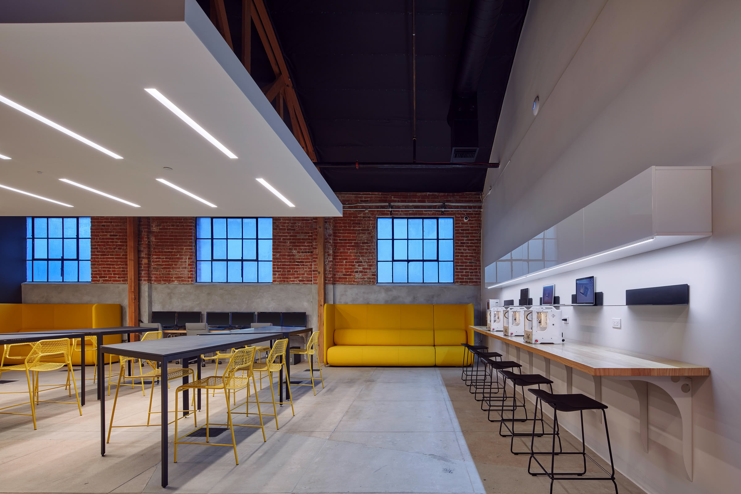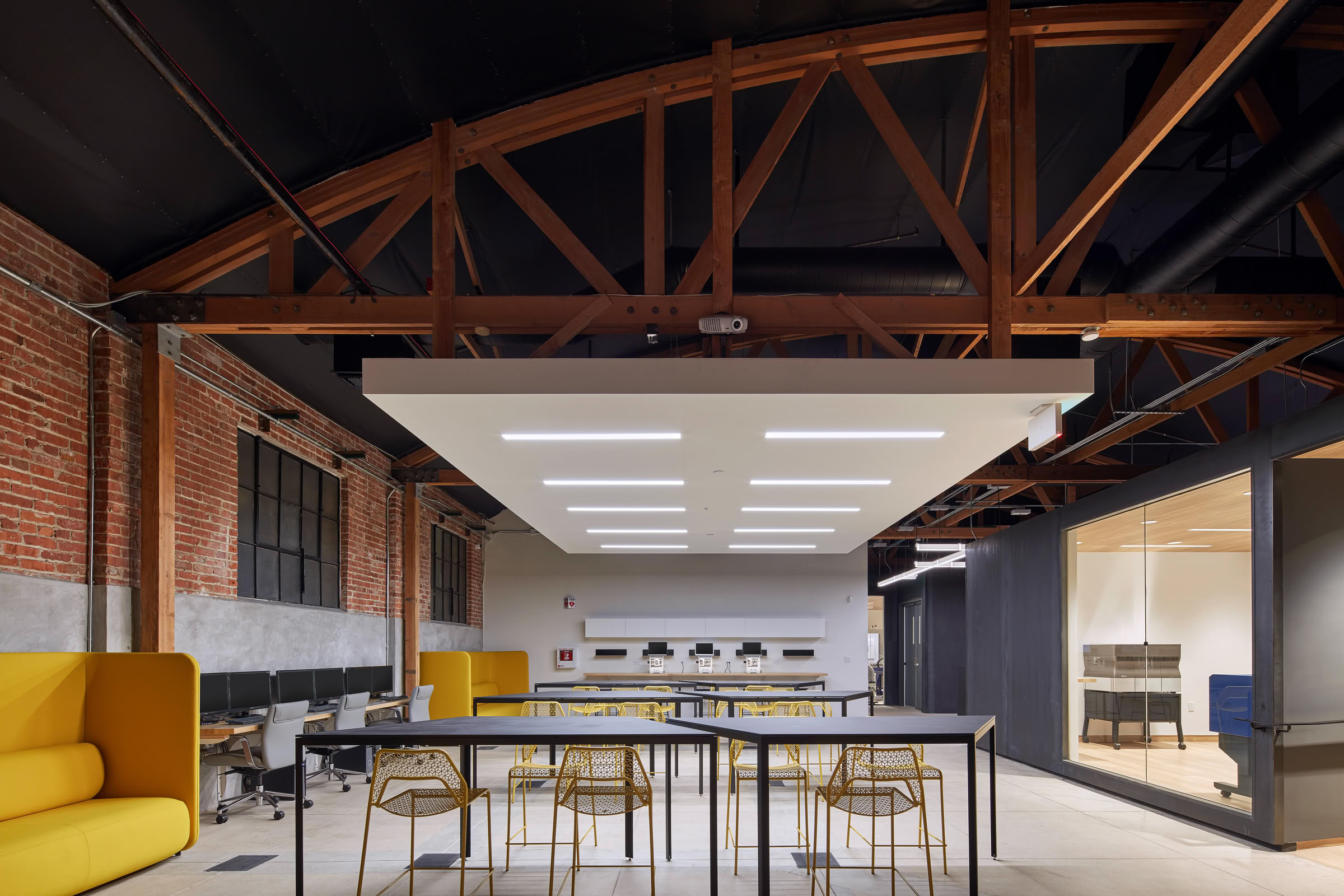 A single 4,900-square-foot floor was designed to operate as gallery, fabrication lab, residency, and brand activation space. The tension is resolved through deliberate contrast: blackened steel, raw concrete, and rough-sawn timber set against precise white surfaces and refined furnishings. The result functions as factory, gallery, and stage within a single continuous environment.
